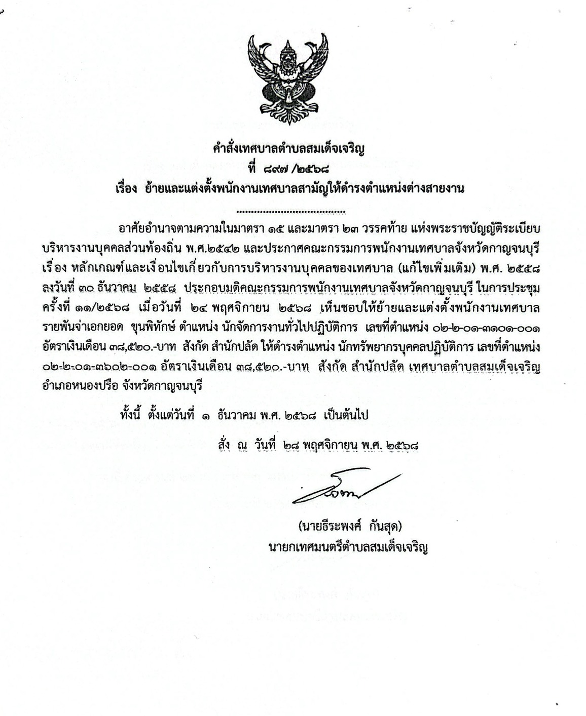 เรื่อง คำสั่ง เรื่อง ย้ายและแต่งตั้งพนักงานเทศบาลสามัญให้ดำรงตำแหน่งต่างสายงาน